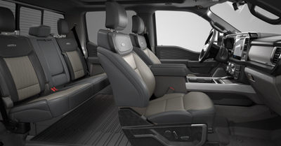 The 2024 F-250 King Ranch boasts leather seating with two-way lumbar support, dual-zone automatic climate controls, upfitter switches, and an optional twin-panel moonroof.