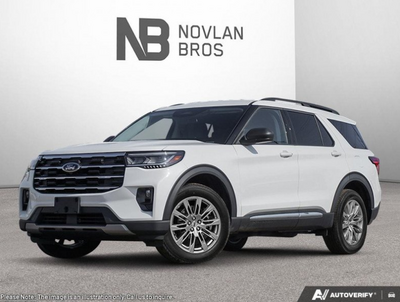 Visit Novlan Bros and discover the 2025 Ford Explorer Active. Wrapped in Star White Metallic panels, this four-cylinder delights with each press of the pedal. Roof rails emphasize the long body, while the rear boasts a sporty spoiler. The metallic grille is framed by LED headlights, and black trim perfectly complements the 20-inch painted aluminum wheels and dual power mirrors. A panoramic sunroof completes the look.