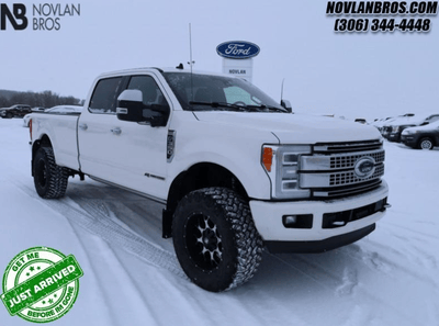Available at Novlan Bros is the 2019 Ford F-350 Platinum. Though this 4x4 proves its value through segment-leading V8 performance, it also offers a dynamic profile - fusing its military-grade frame with unexpected upgrades. Polished aluminum wheels assure an athletic stance, while chrome accents perfectly complement the white panelling. Power extendable trailer tow mirrors flank the sculpted sides; a Tough Bed liner adds a rugged touch to the rear; and the textured grille is centred between wide-angle LED headlamps, creating a striking focal point.
