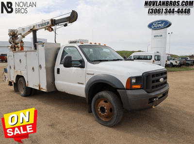 Visit the Novlan Bros dealership to discover the 2005 Ford F-550 XL. This Super Duty model - which is available for under $25,000 - delivers exceptional performance to Saskatchewan, with its 6.0L V8 diesel engine generating up to 325 HP and 570 lb.-ft of torque. A rear-wheel-drive assures smooth handling, accommodating even the heaviest cargo with ease; while the TorqShift automatic transmission deftly responds to changing terrains. Fitted with an exclusive Service Body, this dual-wheel platform proves ready to impress at the job-site.
