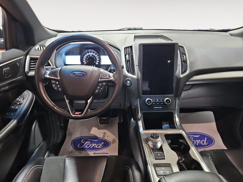 Our Edge's trim level is ST. Stepping up to this Ford Edge ST is an excellent choice as it comes fully loaded with an impressive list of aggressive features including unique aluminum wheels, exclusive exterior styling and a black front grille, a Bang & Olufsen 12 speaker premium sound system, power rear liftgate, heated leather seats with Miko suede inserts, FordPass Connect with a 4G LTE hotspot, an 12 inch touchscreen featuring SYNC 4, wireless Apple CarPlay and Android Auto, a leather wrapped steering wheel and dual zone automatic climate control. For added safety and convenience, you will also get Ford Co-Pilot360 with blind spot assist, lane keep assist, automatic emergency braking, lane departure warning, a proximity key for push button start, front fog lights, a remote engine start and a rear view camera with rear parking sensors. This vehicle has been upgraded with the following features: Sunroof, Heated Seats, Navigation, Alloy Wheels, Leather Interior, Power Trunk, Remote Engine Start.